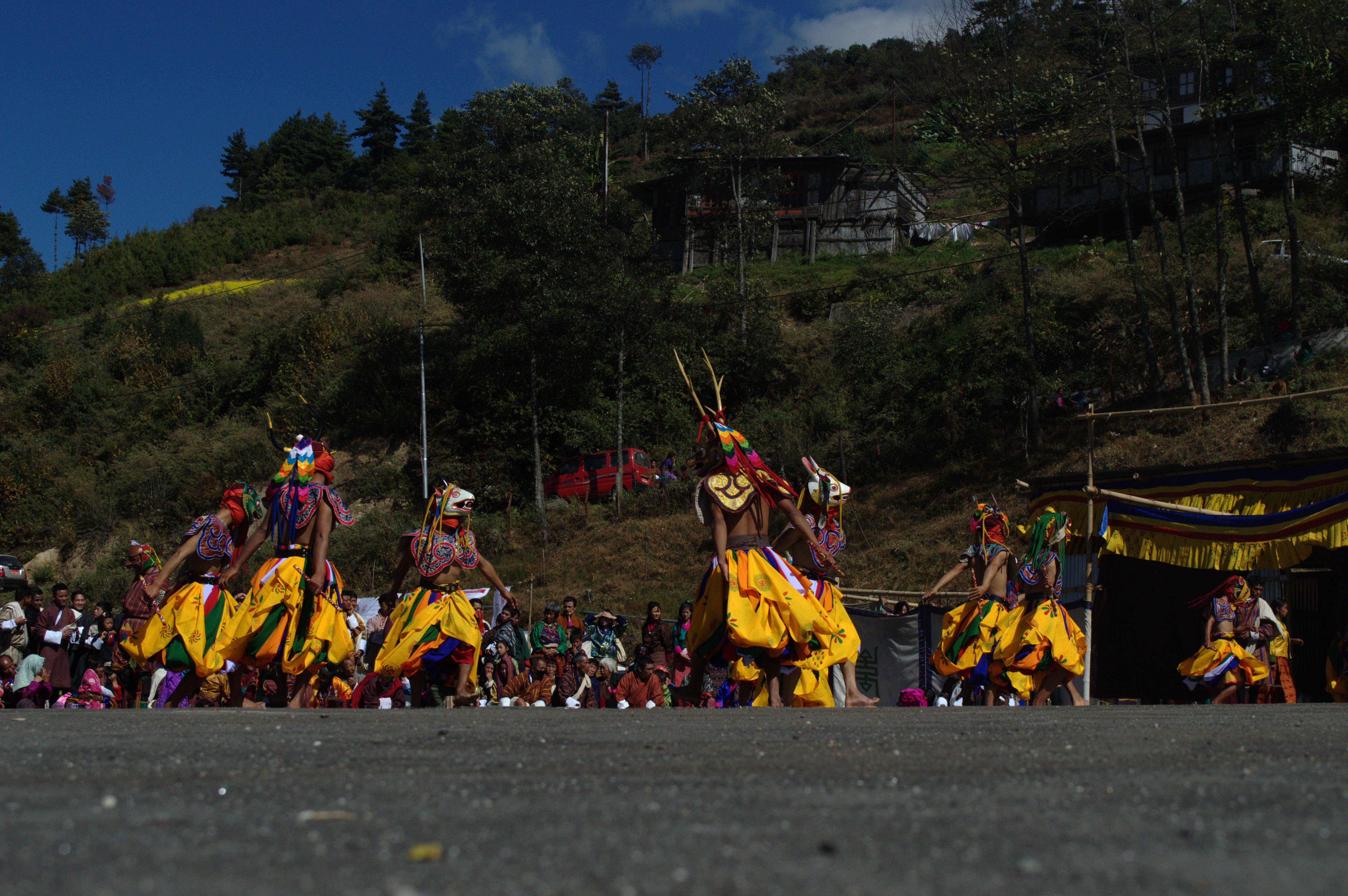 There are three types of the sacred dances introduced by Tertoen Pema Lingpa and Juging Cham is one of them. It was in fiftteenth century the Driging Cham was introduced to subdue all the spirits who tends to harm and destroy the spread of Buddha Dharma. The shot was taken from the east of the image. The performer wears the pig mask and it was made of wood. It was in fiftteenth century the