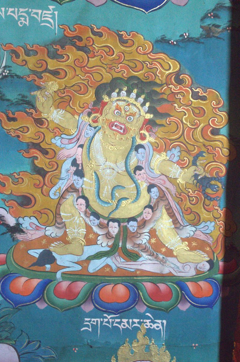 Painting of Drakpo Marchen or Guru Drakpochoe on the wall of home of Khandro Sonam Palden at Wang Danglo. Drakpo Marchen is a wrathful manifestation or form stands on a lotus and tramples on various figures. He holds in his raised right hand the vajra (diamond scepter) and in his other the scorpion. His body is adorned with snakes as necklaces, armlets, bracelets and anklets, and he wear the