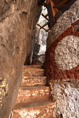 The steps inside Machig temple are made in between two alls as the place is conjusted and is located on the cliff cave. Machig Labdrön མ་གཅིག་ལབ་སྒྲོན (ma gcig lab sgron) was a renowned 11th-century Tibetan tantric Buddhist practitioner, teacher and yogini who originated several Tibetan lineages of the Vajrayana practice of Chöd. in some case Machig is also