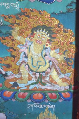 Painting of Drakpo Marchen or Guru Drakpochoe on the wall of home of Khandro Sonam Palden at Wang Danglo. Drakpo Marchen is a wrathful manifestation or form stands on a lotus and tramples on various figures. He holds in his raised right hand the vajra (diamond scepter) and in his other the scorpion. His body is adorned with snakes as necklaces, armlets, bracelets and anklets, and he wear the