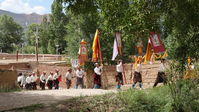The both villages altogether have five tangka and one statue (the upper village, two and the lower village, three) to carry during the Luru Festival. The tangka are paintings of Anyé Seusé, Ziji Wangden, and Gongmin Rilang. The tangka-carriers are the families of the original owner, so are with the spear-carrying warriors and Anyé Seusé's statue. They are also the people who are charged with