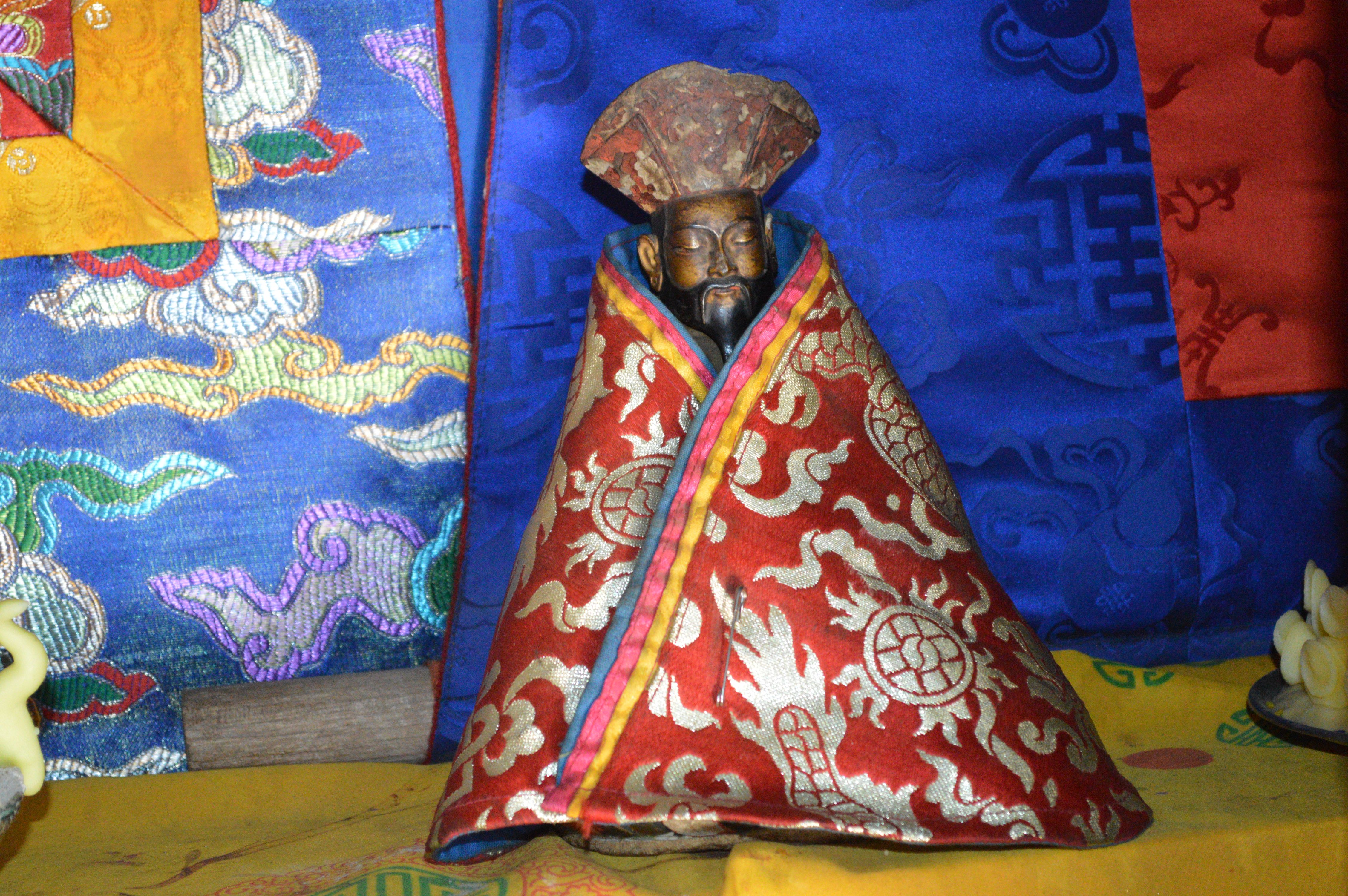 A statue of Zhabdrung Ngawang Namgyal covered by satin cloth